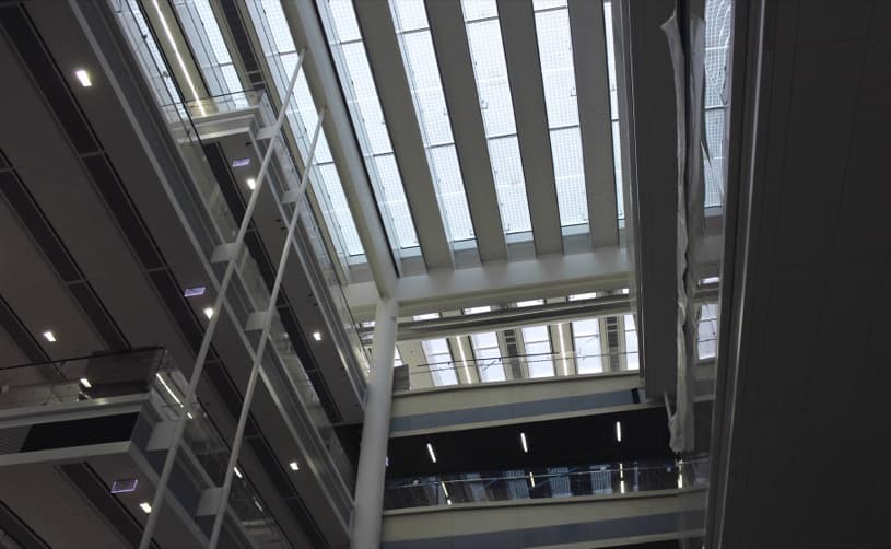 Este fantástico lucernario es un impresionante proyecto de integración de energía solar en un edificio. Ocupa una superficie de 2.500m2, y se realizó para la nueva sede de la compañía Novartis Pharmaceuticals (New Jersey, EE.UU.). La ejecución fue llevada a cabo por la filial española de Onyx Solar en aquel país. Dicha instalación se convirtió en todo un referente internacional por su innovación y sostenibilidad, siendo capaz de producir más de 270.000 kWh/año de electricidad limpia. Esa cantidad de energía es el equivalente a la iluminación de más de 600 viviendas. A este beneficio hay que añadir el ahorro energético (en iluminación artificial) que supone dotar a un edificio de un lucernario tan grande.
