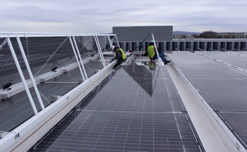 El proyecto no estuvo carente de cierta complejidad, ya que está compuesto por 820 módulos fotovoltaicos semitransparentes (vidrio). Están hechos con células cristalinas perforadas que aportan una distribución más homogénea de la luz en el interior. Esto es algo fundamental, tratándose de un edificio de oficinas. Con el fin de facilitar el mantenimiento de la instalación, todos los paneles son operables, como bien se muestra en algunas de las fotos.