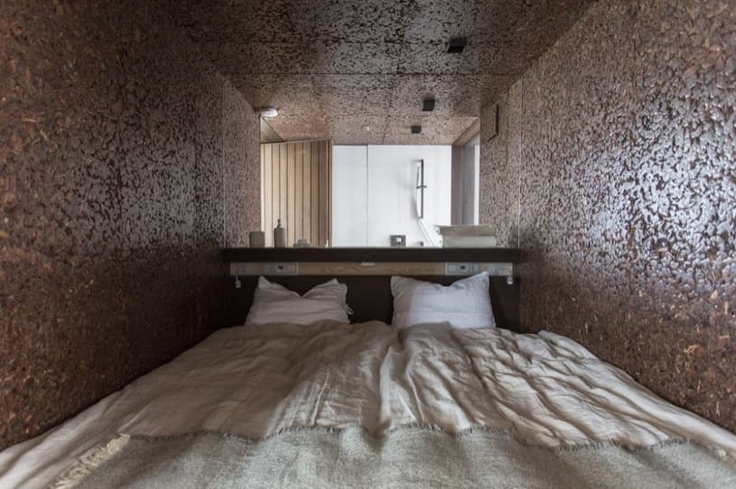 El tercer elemento que habrá quedado en el recuerdo de quienes se acercaron por la Villa Solar de Irvin (California) debió ser el dormitorio de LISI. Tiene el mismo tamaño que el módulo del cuarto de baño y elementos técnicos. Como se puede apreciar en las fotos, la cama queda encajada por tres de sus lados, siendo además de vidrio (100% transparente) la «pared» que separa dicho espacio del baño. El mensaje es claro: la privacidad frente a los extraños sí importa, pero entre los miembros de la familia, no.