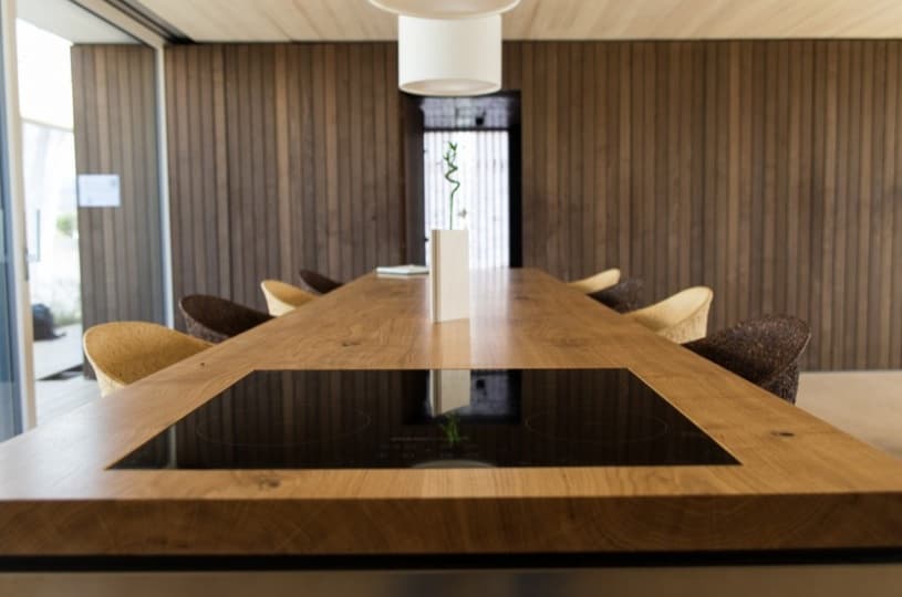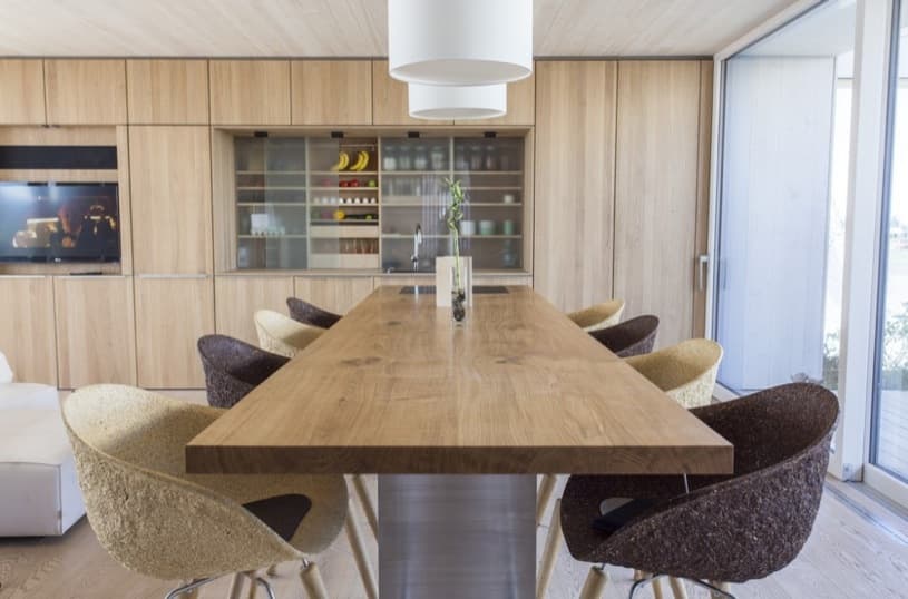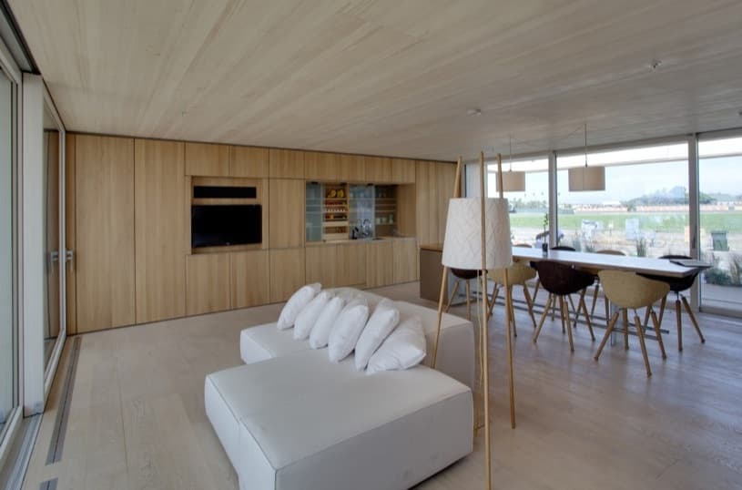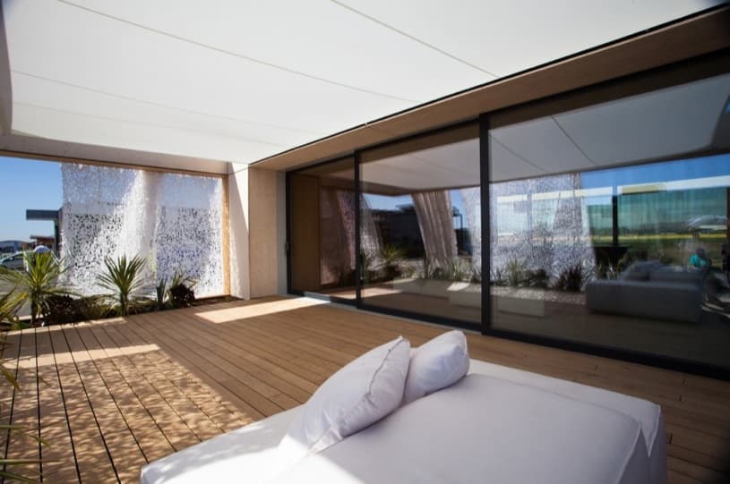 El segundo aspecto destacable de esta vivienda es que está pensada para disfrutar de la vida al aire libre. Posee un gran espacio multifuncional (cocina, comedor y sala) comunicado por grandes puertas correderas a unos patios opuestos. Esta disposición garantiza una estupenda ventilación, permitiendo que la casa gane mucha superficie hacia el exterior. ¿Y qué fue lo primero que vimos? … pues las cortinas. Los responsables de este proyecto decidieron que no había mejor manera para garantizar cierto grado de privacidad a sus ocupantes, que añadir en todo el perímetro del edificio unas cortinas blancas perforadas.