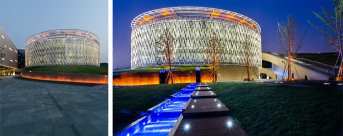 El Suzhou District Planning Exhibition Hall está compuesto por dos volúmenes bien distintos. Uno tiene forma de «L», y está bordeando a otro con forma cilíndrica. Ambos se diseñaron para funcionar de una manera bastante eficiente. El primero tiene una imponente azotea ajardinada inclinada, que arranca desde el nivel de calle. Esto ofrece a los visitantes unas hermosas panorámicas de la zona, al tiempo que supone un magnífico aislamiento natural para el edificio. En el cilindro encontramos una singular celosía metálica diseñada como protección de la radiación solar. Aparece tanto en fachada como en su cubierta, adquiriendo con la iluminación nocturna un interesante relieve.