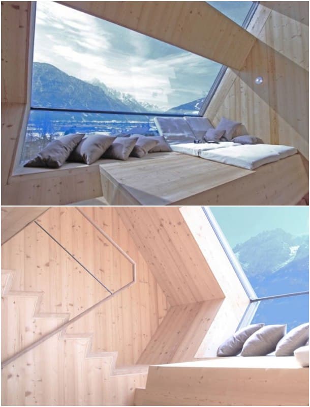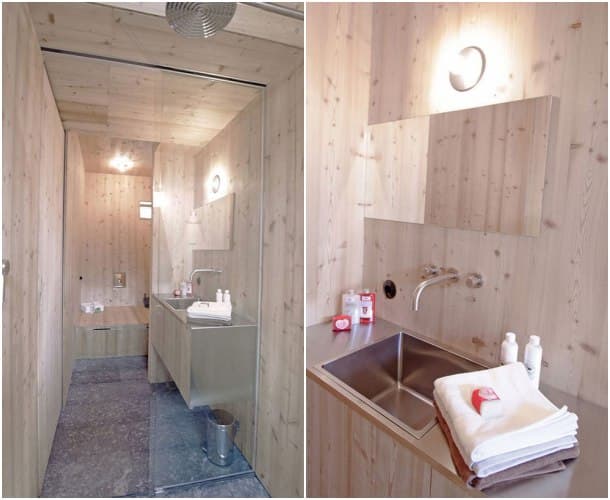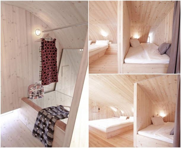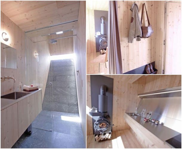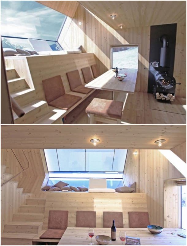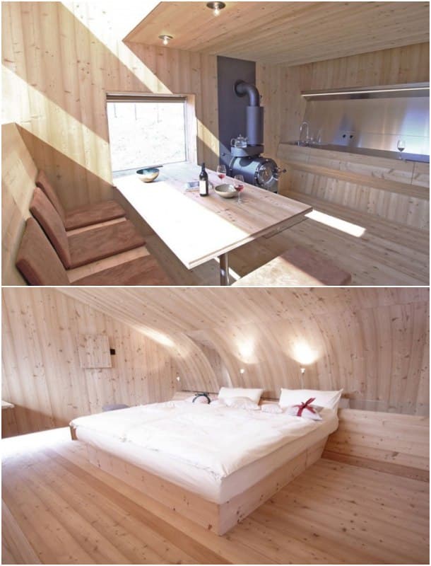 El equipamiento incluye una cocina-comedor, cuarto de baño, y un altillo con capacidad para que puedan dormir cómodamente unas 6-8 personas. La zona de estar se sitúa a un nivel intermedio. Su geometría curva y grandes ventanas ofrecen unas estupendas panorámicas de su entorno. Pero ante todo se trata de un refugio con un interior muy confortable, por los revestimientos de madera y la estufa de leña que preside la sala principal (también hay aire acondicionado para el verano).