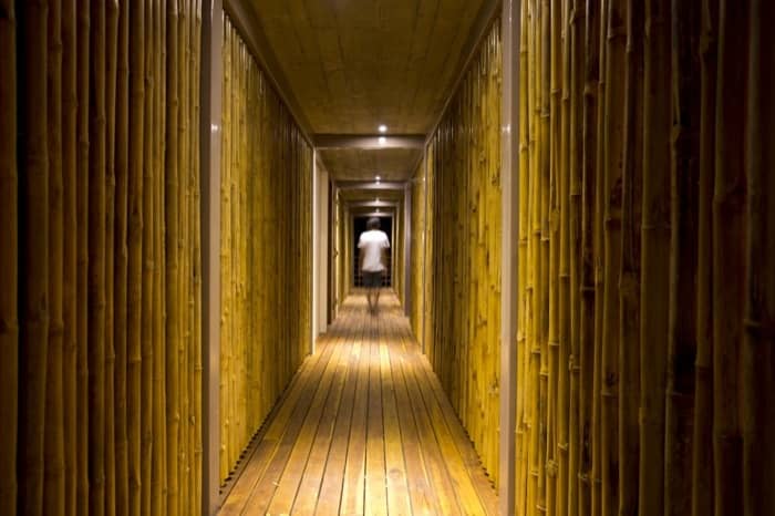 Muchos de los elementos (y parte del mobiliario) están hechos con madera de teca local. Hemos de añadir que la Casa Flotanta recoge y almacena el agua de lluvia, tiene paneles solares térmicos que proporcionan agua caliente y calefacción, y una iluminación con tecnología LED. También tiene prevista una instalación de paneles fotovoltaicos.