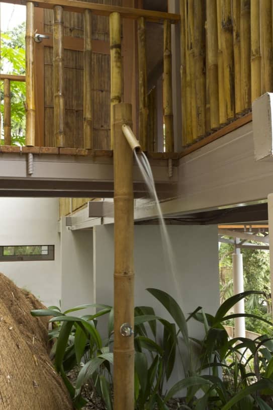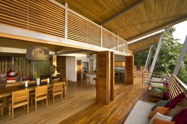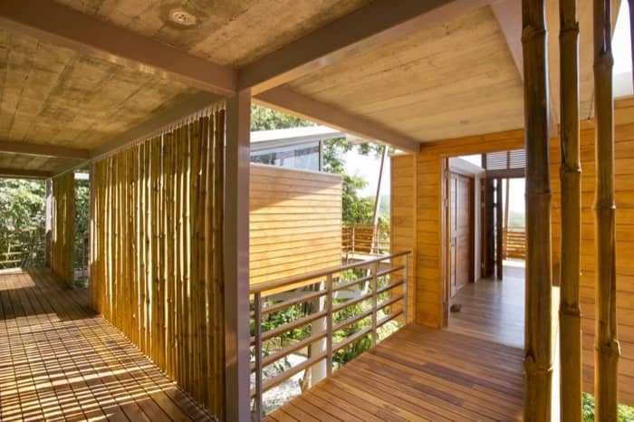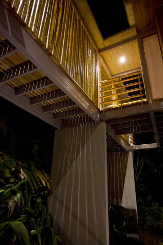 El módulo más grande contiene la sala, cocina, y comedor, además de una amplia terraza con vistas sobre la selva y el océano. Esta terraza está conectada con las de los dormitorios, uno en cada módulo. El cuarto de ellos lo forma el baño principal, que está orientado hacia la colina, y todos los módulos comunican a un corredor que tiene las paredes de bambú. Se podría decir que se trata de una vivienda construida sobre un puente.