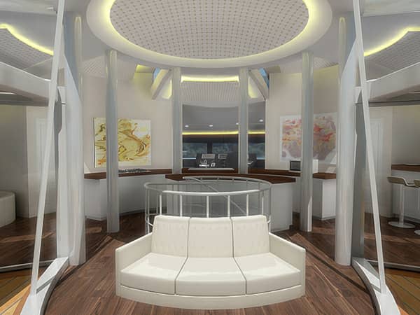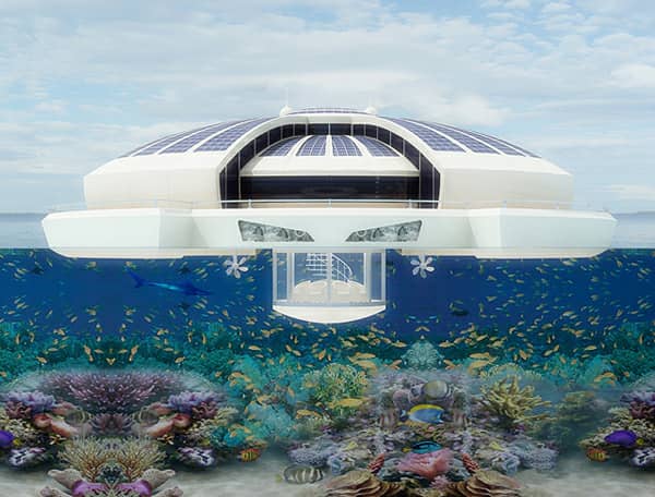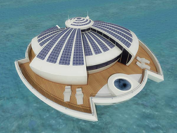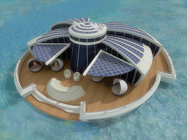 Resulta difícil clasificar un diseño como el que traemos hoy. Puede definirse como un resort flotante, un refugio de lujo en el mar, una mini-isla,… Solar Floating Island (SFI) tiene capacidad para alojar a seis personas, además de una sala de observación bajo el agua. También es autosuficiente, pues cuenta con un importante recubrimiento de láminas fotovoltaicas.
