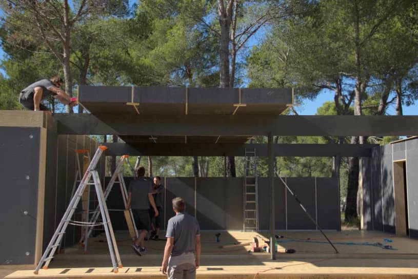 El mismo proceso, pero con bloques y maderas de diferentes tamaños, se sigue para los muros y techos. Esa estructura luego se impermeabiliza, se fijan unos soportes para el revestimiento final, que en la cara exterior es de madera, pasando luego a las carpinterías, y el resto de acabados. Lo único que nos ha desconcertado un poco ha sido el acabado interior que se puede apreciar en el vídeo, pues hubiera quedado mejor en un tono más claro.
