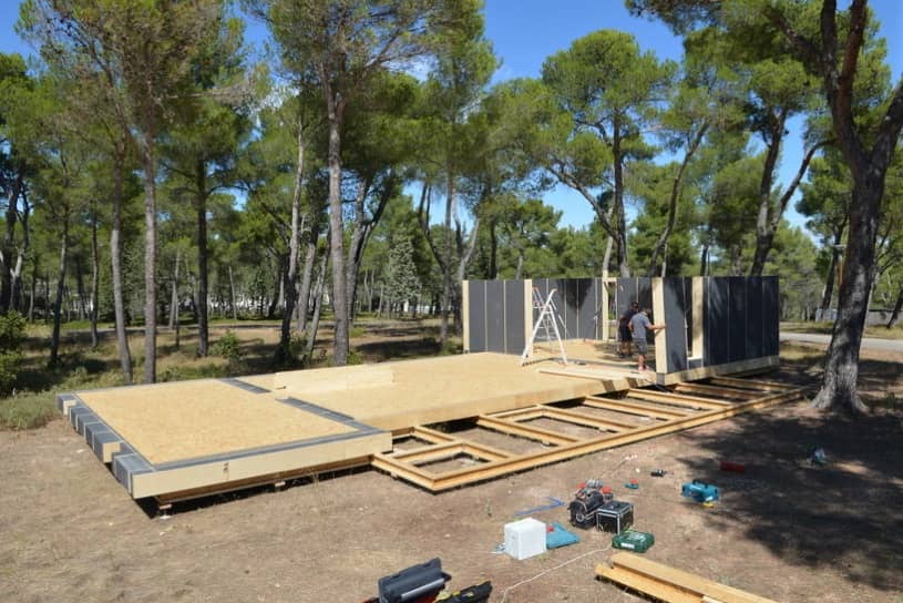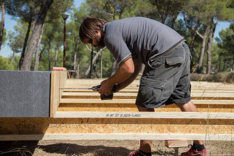 Los materiales principales son poliestireno expandido (EPS) y panel laminado de madera blanda (LVL). Para su montaje no se requieren herramientas especiales, aunque se recomienda el uso de un destornillador eléctrico. Todos los bloques y tablas estás previamente clasificados y con el tamaño correcto. Pero si fuera necesario realizar algún corte, con una sierra circular y un ‘alambre caliente’ bastarían.