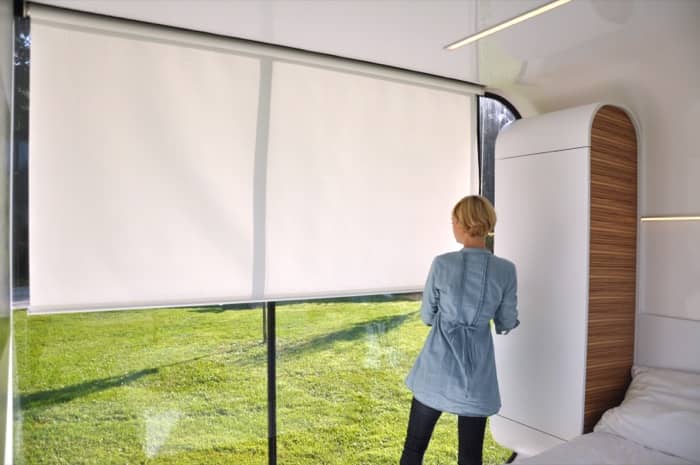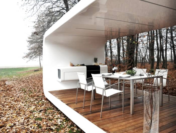Coodo es básicamente un marco con esquinas redondeadas y fachadas opuestas completamente acristaladas. Esto crea un espacio estupendo para disfrutar del paisaje. Viene con los electrodomésticos, muebles, todas las instalaciones, incluidas las de calefacción y refrigeración. Y además se puede personalizar a nuestro gusto. Se fabrica empleando un número reducido de recursos, con materiales que cumplen con elevados estándares ecológicos. Son de procedencia preferiblemente local, con el fin de reducir al mínimo las rutas de transporte.