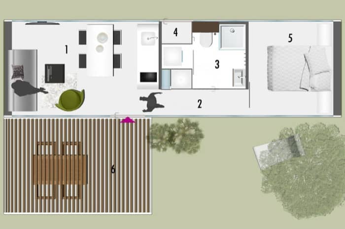 Tiene un tamaño de 11 x 3,2 x 3m. Este modelo del catálogo Coodo ya puede funcionar como una pequeña vivienda. Hay cuatro posibilidades. La versión Plain va con lo mínimo, similar a la del modelo 24. Lo mismo ocurre con la versión Basic. Pero este módulo se pone interesante en las versiones siguientes. Hay una denominada Full-Living que viene con baño, cocina, dormitorio y sala de estar. Es posible añadirle una pérgola/terraza, entonces estaríamos en la versión +Pergola del Modelo 36. Hay acabados en White y Grey.