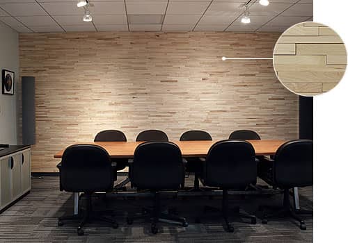 El panel Interwoven está disponible en seis opciones diferentes, utilizando madera de nogal, arce, o roble americano. Tiene una longitud de 135,9cm y una anchura de 34,3cm, con un espesor de entre 3-6mm. Pero los extremos están preparados para que se unan de manera entrelazada, y no aparezca ninguna junta vertical en el ritmo de la tablillas. Esto es fundamental para conseguir un acabado de calidad, dando la sensación de que la pared se ha revestido colocando las tablillas de una en una.
