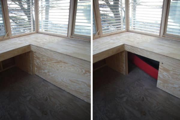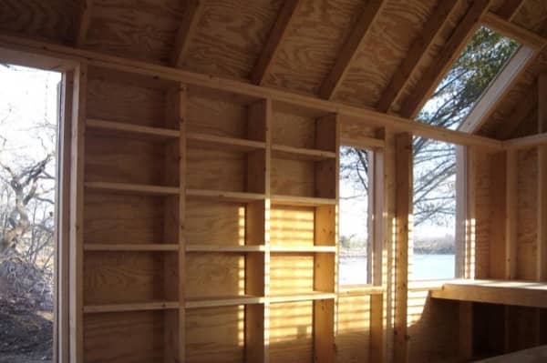 El espacio interior es bastante espartano. Hay un escritorio bien iluminado y orientado hacia el río; una pared cubierta de estantes; y un lugar donde dormir, justo encima del hueco destinado a esconder la canoa. Hay que señalar que las ventanas más soleadas tienen unas mallorquinas exteriores para protegerse del calor en verano. Eso también contribuye para hacer el edificio más seguro.
