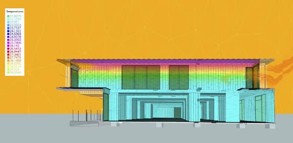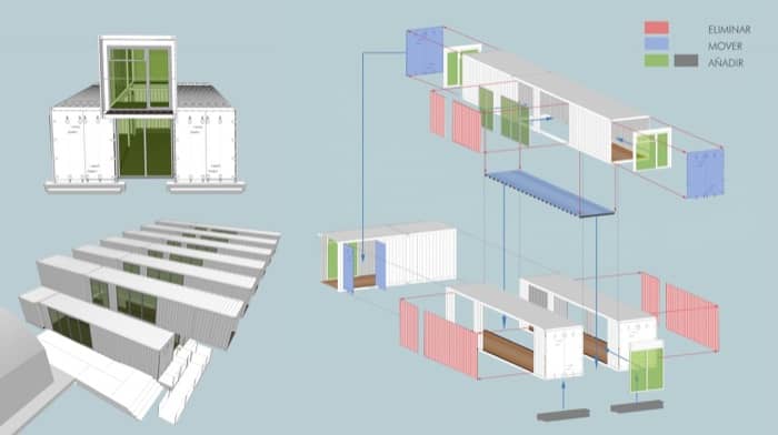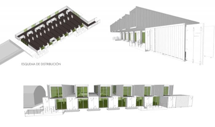 Unos huecos situados estratégicamente en los contenedores superiores, permitirán la ventilación cruzada natural que expulse el calor hacia el exterior, funcionando también como lucernarios. Este recurso bioclimático está acompañado de una pintura blanca exterior que provoca la reflexión del 90% de la radiación solar, con una composición de microesferas cerámicas que evita un excesivo calentamiento de la fachada.