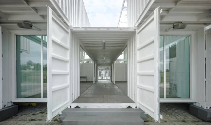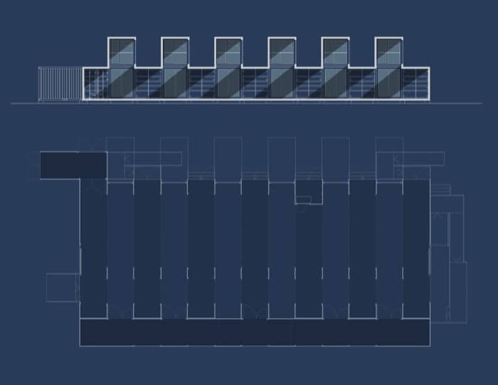 Este proyecto ocupa una superficie de 508m2. Está compuesto por 23 contenedores reciclados, que fueron alterados y preparados en taller en un proceso que tardó 45 días en completarse. Algunos de estos módulos son «high cube» (su altura es de 2.93m) y van colocados en paralelo. Sobre ellos se apilan de manera alternada otros de formato estándar. A estos últimos se les recorta la base, con el fin de crear espacios de doble altura que ayuden a reducir la temperatura interior del recinto. Esto permite que el aire más caliente se desplace hacia arriba. Es importante tener en cuenta que no se les ha aplicado ningún material aislante a los contenedores.
