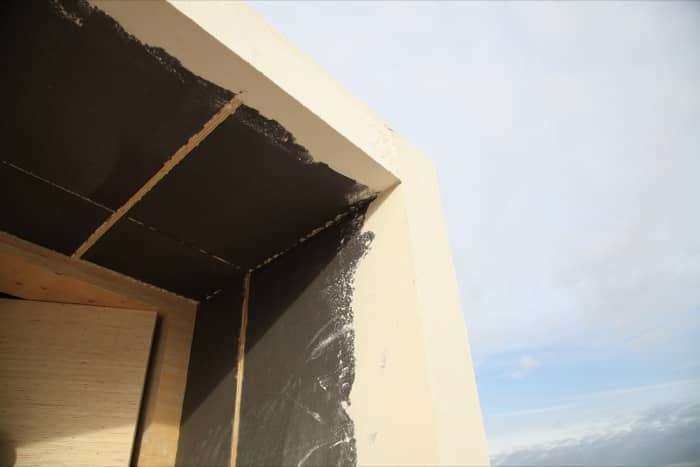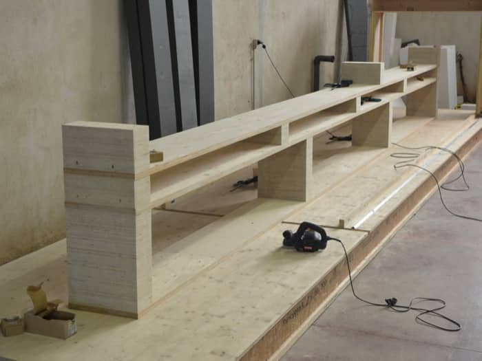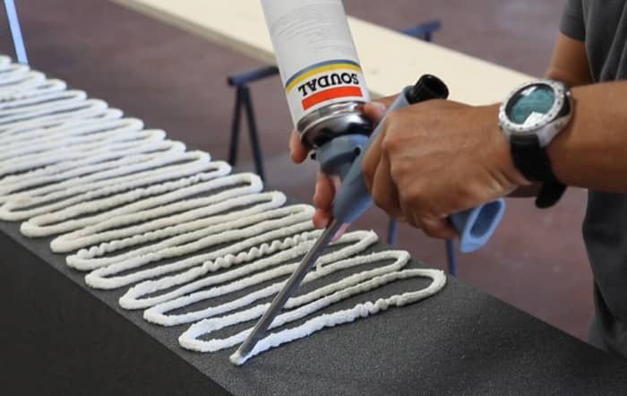 Hoy traemos unas fotos de otro ejemplo construido con Popup-House: la Oficina Pasiva de 70m2. En esta ocasión en vez de utilizar largos tornillos para la unión de los bloques de aislante y la madera, se ha empleado un pegamento de espuma de poliuretano, según se puede apreciar en la siguiente fotografía.