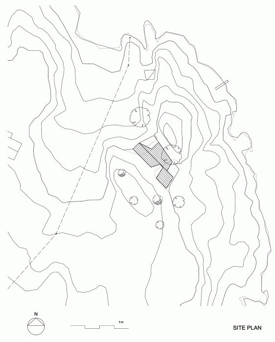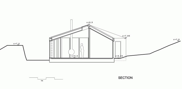 A pesar de tener una forma bastante irregular, está organizada prácticamente en dos mitades. Por un lado tenemos una gran sala de estar y zona de comedor, y por otro dos dormitorios, baño, y cocina. Separado por la entrada queda el dormitorio principal (con baño) y un aseo. El aspecto más peculiar de esta cabaña es que está revestida exteriormente con paneles de aluminio, con lo que sus fachadas adquieren múltiples alteraciones, dependiendo de la luz ambiental.