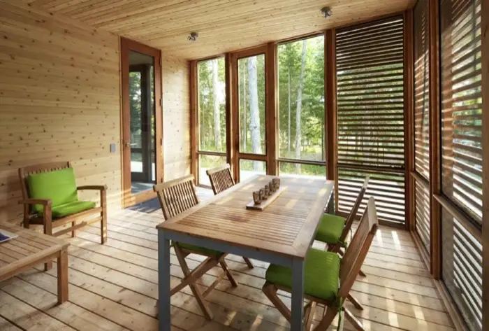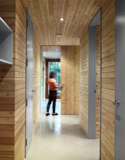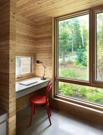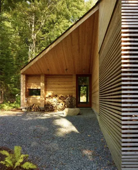 El diseño de esta casa de campo recoge la calidez de las cabañas tradicionales. Pero se resuelve finalmente con las líneas puras de la arquitectura contemporánea. Su construcción se realizó en un terreno que evitó la tala de árboles, empleando madera de cedro sostenible sin tratar. Esta madera con el tiempo va adquiriendo un color más grisáceo. Eso ayuda a camuflar el edificio dentro del bosque. La cabaña cuenta con estupendas vistas hacia el lago.