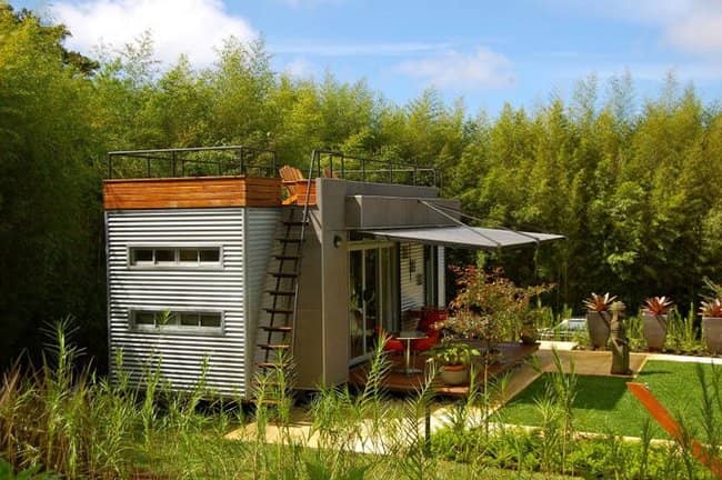 El contenedor de carga se alteró añadiéndole diferentes huecos, uno de ellos bastante grande. Así tenemos una gran puerta acristalada de entrada que inunda de luz natural el interior. También su cubierta se ha modificado para que se pueda subir a ella y utilizar como terraza. En la parte delantera hay otra terraza, con un ‘toldo’ que se abate para darle seguridad a la casa.