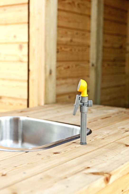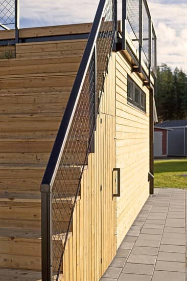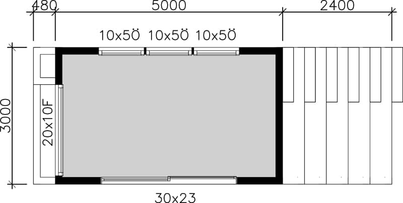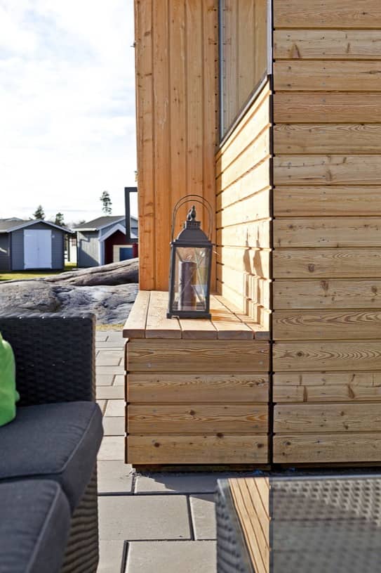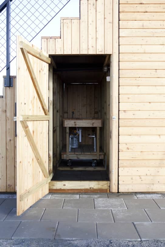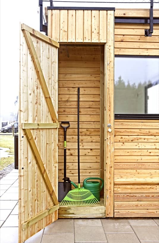 El cobertizo Steps 15 se fabrica con madera procedente de bosques sostenibles (alerce siberiano) y cuenta con unos espesores considerables de material aislante. Se utilizan 145mm en suelo y techo, y de 95mm en muros. La gran puerta corredera de entrada, y sus ventanas, hacen que todo el interior (pintado de blanco) sea muy luminoso.