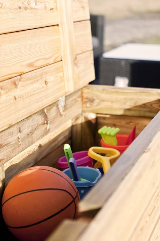 La escalera de subida a la terraza superior ocupa toda la anchura de la caseta, aprovechando sus dimensiones tanto fuera como dentro. Sus peldaños se utilizan para el cultivo de plantas, y debajo hay espacio de almacenamiento. Ahí se guardan los muebles de jardín, y una cocina portátil para utilizar al aire libre. Nótese que este hueco bajo para la escalera es accesible tanto desde la parte delantera como trasera del cobertizo. Existe también la posibilidad de añadirlr en el otro lateral un banco para sentarse, y un armario.
