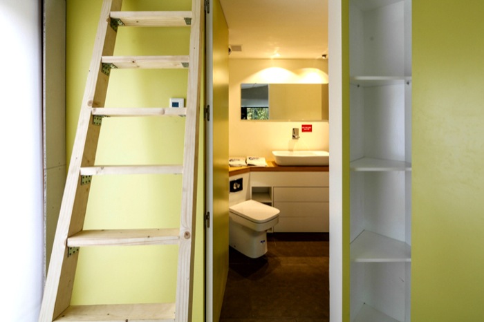 La casa SymbCity se organiza en tres áreas. La más estrecha es la que comprende los cuartos técnicos y húmedos (baño, cocina). Le sigue un espacio mucho más amplio para comer, dormir, y trabajar. Y por último una zona que puede funcionar como un invernadero o patio. Viendo las fotos de su interior, comprobamos que el dormitorio no es independiente del resto, pues tan solo una línea de librerías lo separa del comedor. Esto nos induce a pensar que se trata de una casa pensada para un solo ocupante, o a lo sumo para parejas muy, pero que muy tolerantes.
