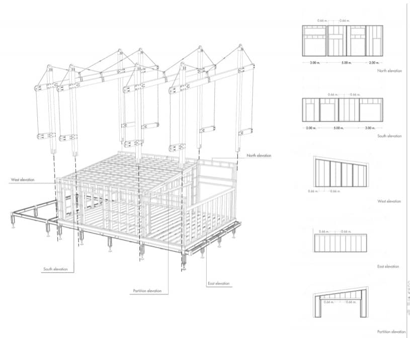Su fabricación se lleva a cabo con materiales sostenibles. Los muros de la estancia principal están hechos con paneles de madera contrachapada, con doble capa de aislamiento, y materiales PCM internos. Las ventanas y vidrios son de baja emisividad térmica.