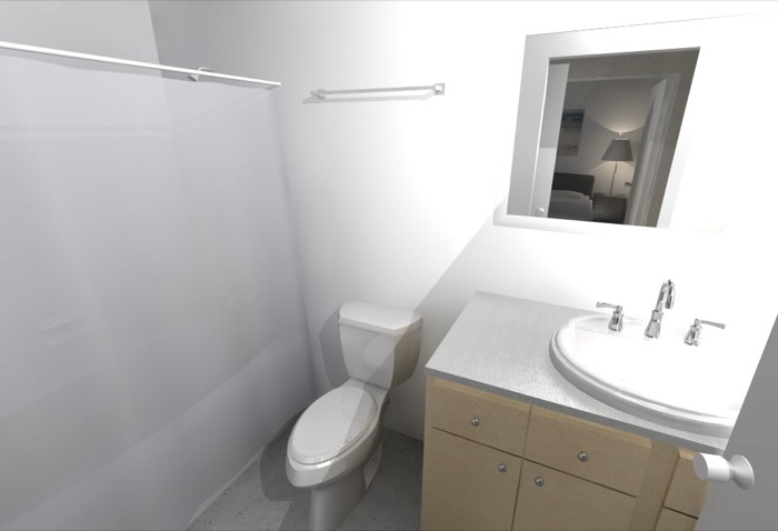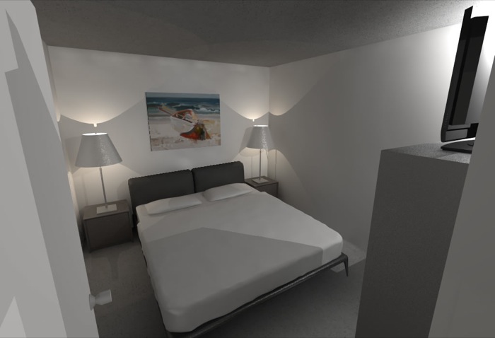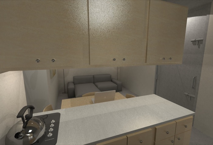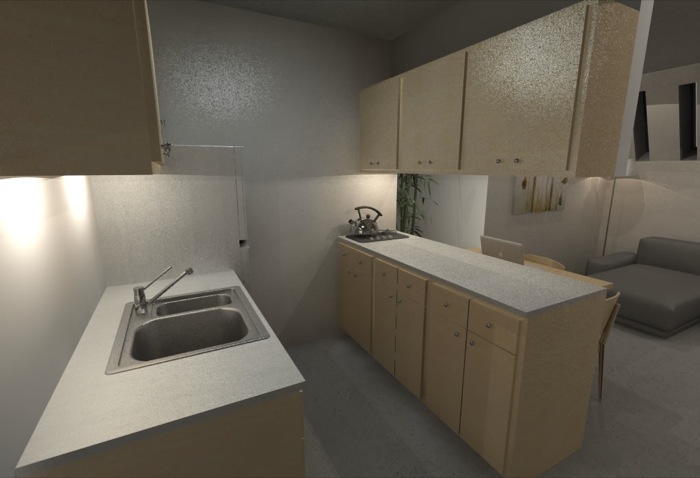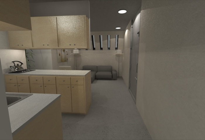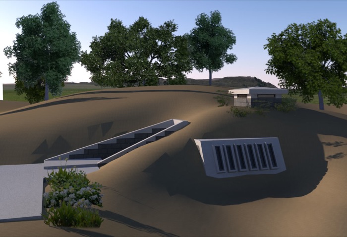Las imágenes renderizadas que traemos hoy corresponden a un refugio subterráneo, de apenas 47m2, que muy bien podría servir para mantenerse a salvo. Está diseñado como un apartamento de un dormitorio. Dispone además de cocina, sala de estar, baño, lavadero, y espacio para cultivar plantas, iluminado desde arriba mediante una especie de claraboya. La puerta de acceso es blindada, y su ventana está hecha con varios huecos estrechos verticales practicados en el muro de hormigón.