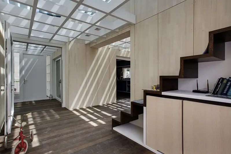 Muchas de las prestaciones pasivas se encuentran en el Espacio+, el elemento de conexión que además es zona de acceso. Esta parte está debidamente aislada, cuenta con lucernarios, pero no dispone de aire acondicionado. Para cada época del año hay una regulación del aire interior con medidas pasivas, ya sea con la ventilación natural (verano) o a través del calor entrante por las claraboyas (invierno).