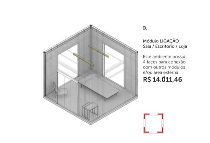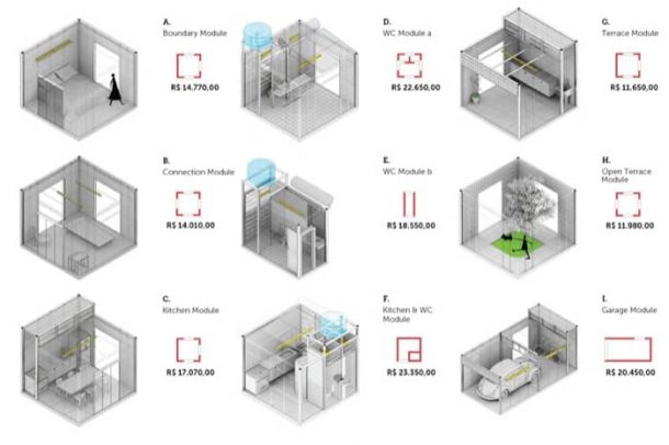 La idea de Casa 3e30 se beneficia de la gran ventaja de los sistemas modulares. Es una manera de adaptarse a las necesidades de sus ocupantes, para configurar viviendas con un número determinado de dormitorios y cuartos de baño. De esta manera, se podrían construir múltiples soluciones. Tan solo basta combinar diferentes módulos, y organizarlo de una forma específica. El ejemplo básico utiliza la superficie completa, los 100m2, dejando un patio central. Pero se han añadido también planos de una propuesta para desarrollar un poblado en Brasil (distrito Jardim Canada, Nova Lima) utilizando este sistema de construcción prefabricada modular (al final del artículo).