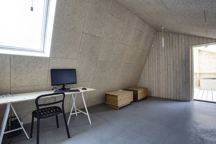 En el «escudo del clima» se han dispuestos los paneles solares térmicos y fotovoltaicos. Estos últimos son muy pequeños, y están colocados siguiendo una trama determinada para proporcionar sombra a la casa. Esta capa también cuenta con aberturas para garantizar una buena ventilación de toda la vivienda. Y una claraboya que deja pasar gran cantidad de luz hacia su interior.
