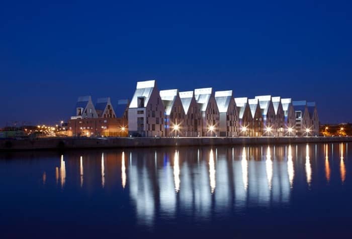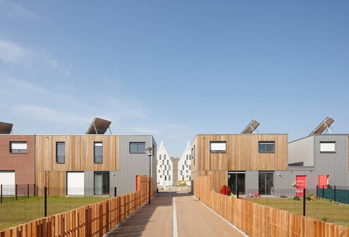 El barrio The Grand Large forma parte de un desarrollo sostenible para la ciudad portuaria de Dunquerque (Francia). Fue la primera fase del Proyecto Neptuno, iniciado en 1991 para orientar la ciudad hacia los muelles. No suelen interesarnos las viviendas adosadas, todas idénticas. Y por la misma razón, tampoco la «arquitectura copia-pega» en un mismo lugar. Consideramos que es una de las mayores aberraciones que un plan urbanístico puede permitir. Dicho esto, lo único bueno de este proyecto es el espíritu sostenible que lleva asociado. Incluye almacenamiento y uso del agua de lluvia, y unos sistemas de energías renovables.