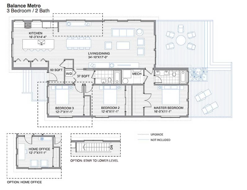 - Balance Metro. Es una versión más estrecha. Está pensada para esas parcelas urbanas en las que resulta más complicado encajar una vivienda. Como resultado de esta disposición, uno de los cuartos de baño es completamente interior.