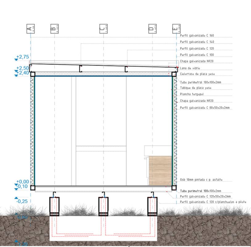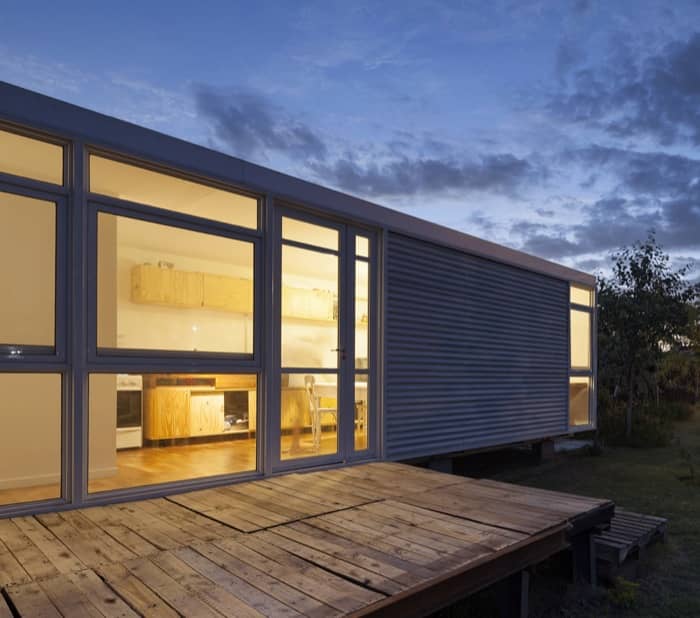 Para su construcción se emplearon materiales industriales que fueran fáciles de manejar e instalar. Su estructura está formada por perfiles metálicos, con dimensiones apropiadas para que los módulos de acabados interiores (paneles de yeso y madera) encajaran en ella. Esto redujo considerablemente la cantidad de residuos. También se emplearon muchos materiales reciclados, como los palés utilizados para formar la terraza, o el suelo de parquet del interior. Todo esto hizo que el presupuesto se redujera bastante. Pero el mayor ahorro vino de la mano de obra. En la construcción de la Casa Mía trabajaron familiares y amigos, empleando herramientas sencillas.