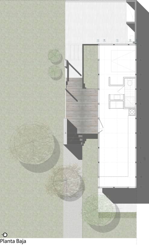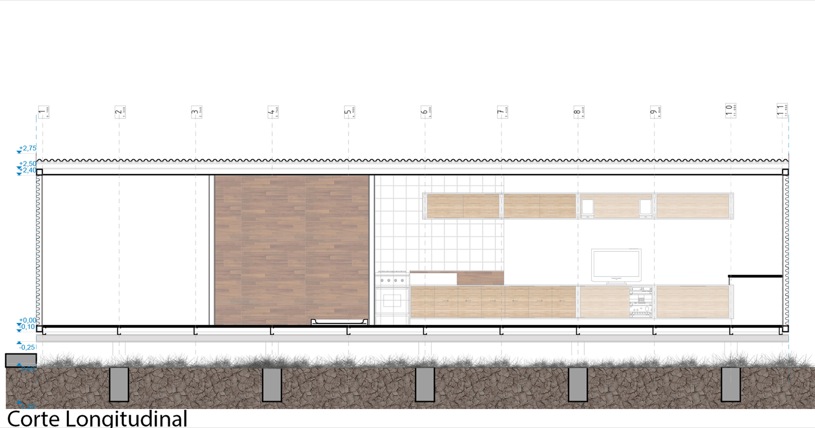 Por dentro es un espacio que reúne las funciones básicas de un hogar. Tiene una sala que contiene la cocina, comedor, y un escritorio, además de una habitación en un extremo para el dormitorio. Hay un cuarto de baño entre ambos espacios. Un detalle importante también lo encontraremos en el mobiliario, dándole continuidad a los muebles de la cocina.