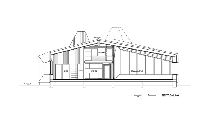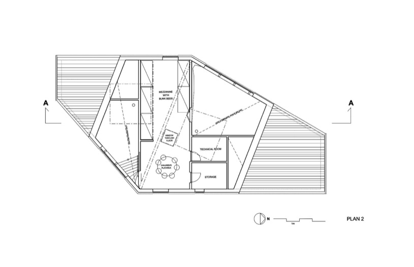 Para encontrarse en un lugar tan apartado, y sin ningún elemento natural que aparentemente le coaccione, su organización interior es bastante caprichosa. Me atrevo a decir que incluso resulta poco práctica: ¿una sala principal con la forma de un triángulo? Pues sí. Además dispone de comedor, cocina, 30 camas repartidas en 6 dormitorios, 2 cuartos de baño. La Cabaña Robot también tiene despensa, cuarto de almacén de leña, y otros cuartos técnicos y de almacenamiento.