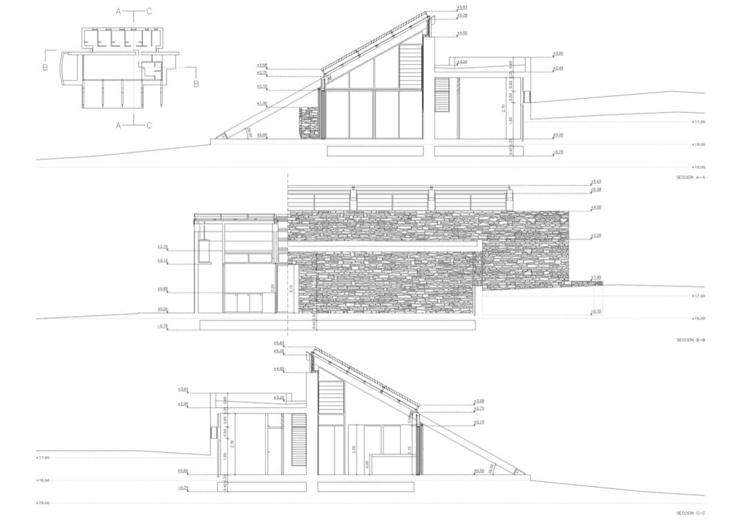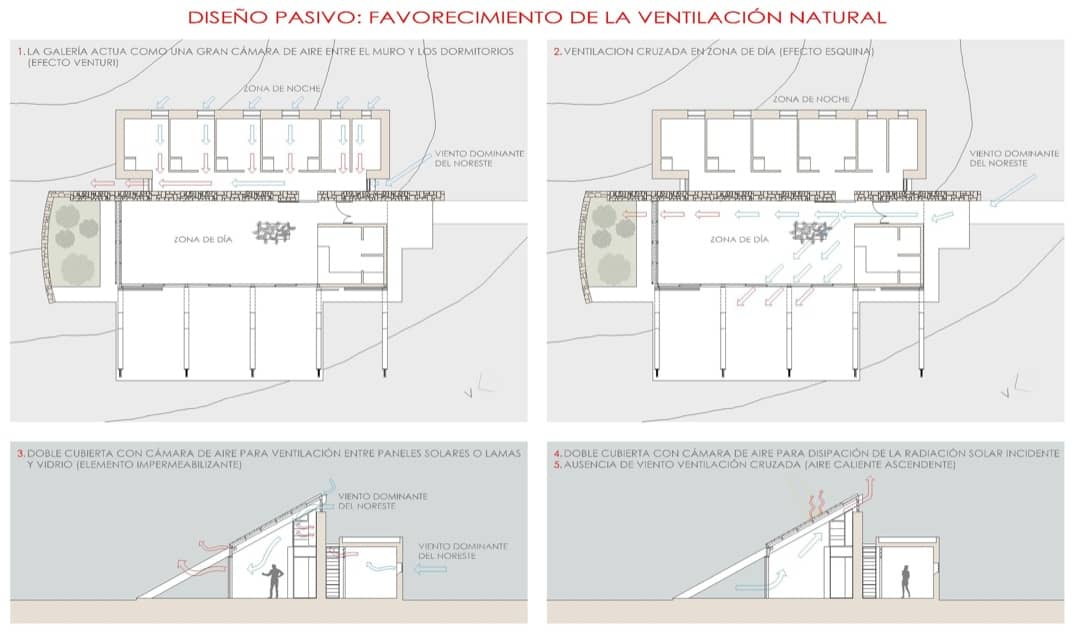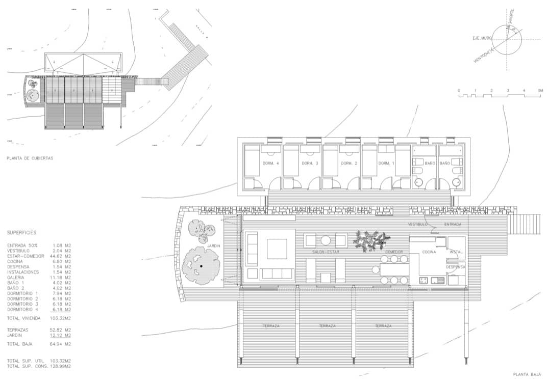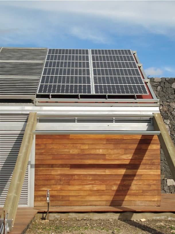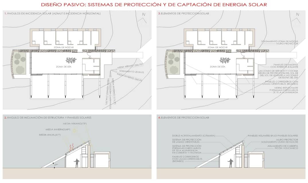 Está diseñada utilizando el muro de basalto como elemento que organiza su interior, poniendo a un lado el espacio de vida, y en el otro los cuatro dormitorios. La inclinación que tiene la cubierta en la zona de día está determinada para optimizar la producción de energía de sus paneles fotovoltaicos y térmicos; y en el diseño general de la casa también se han introducido varias estrategias para que adquiriera un comportamiento pasivo.