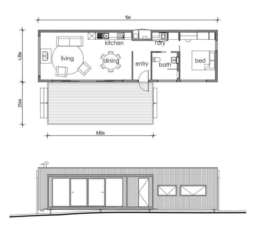 Es un diseño minimalista que ofrece todas las comodidades posibles para un programa de un dormitorio. Cuenta con un baño, un espacio abierto que se utiliza como sala, comedor, y cocina. Los paneles solares de la cubierta garantizan el abastecimiento de energía. Pero además dispone de depósito para almacenar las aguas pluviales, y un tanque séptico para el tratamiento de las aguas negras.