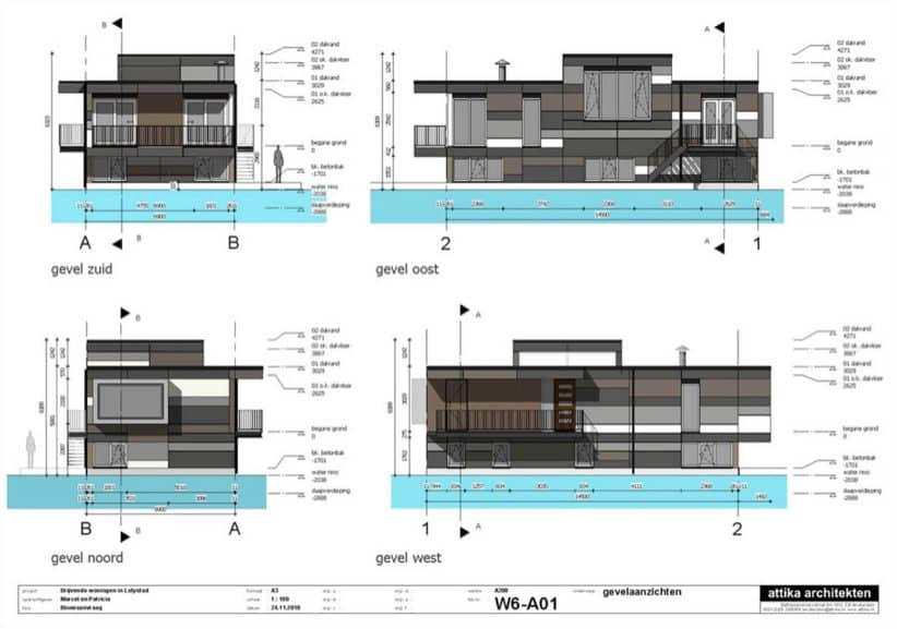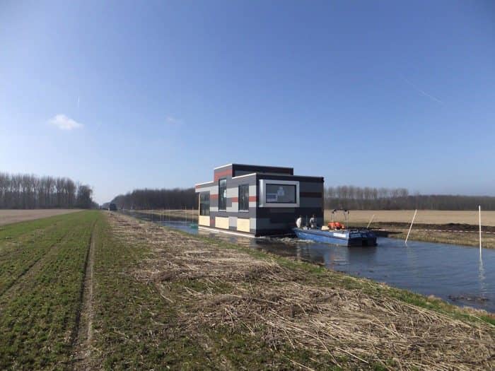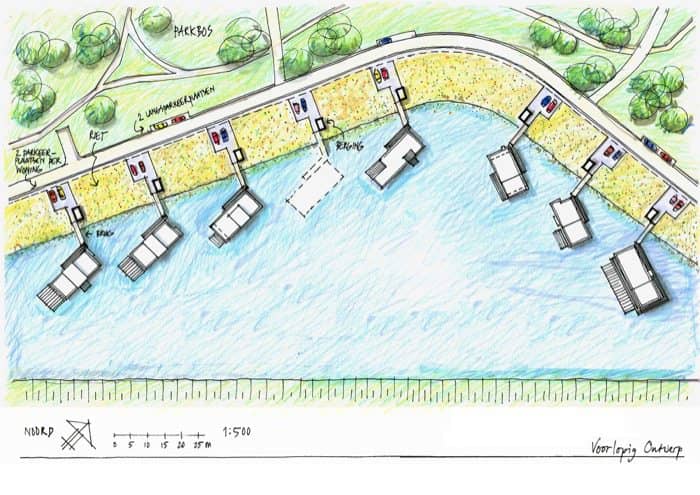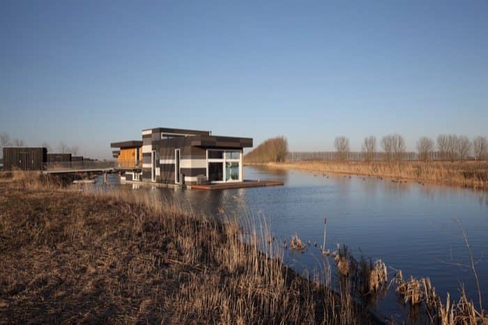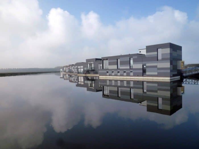 Para entender este proyecto, hay que saber antes de sus propietarios y del lugar en el que se ubica: Lelystad. Es un municipio neerlandés (capital de la provincia de Flevolanda) que tiene casi el 70 de su superficie ocupada por el agua, y que está a unos 5 metros por debajo del nivel del mar. Surgió por encargo de la asociación Drijf-in Lelystad, formada por ocho familias. Querían unas casas flotantes prefabricadas, todas ellas diferentes, pero con muchas cosas en común.