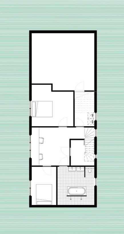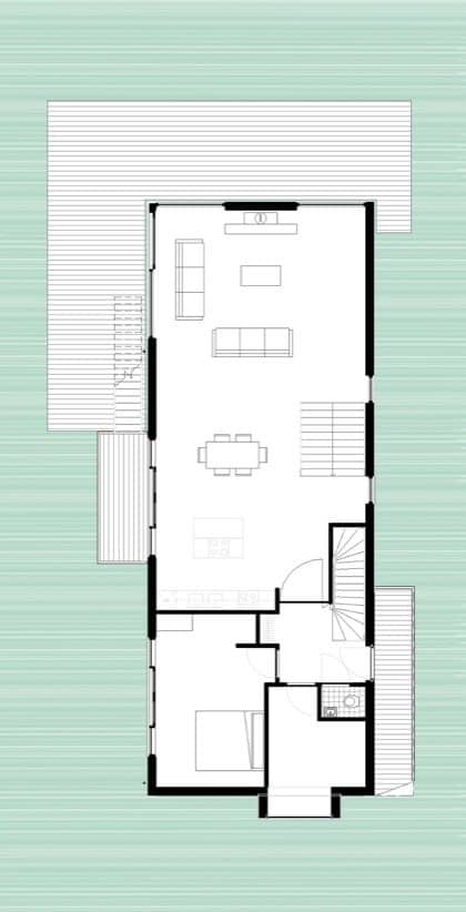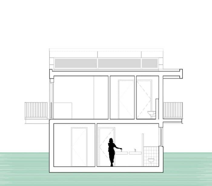 En estas viviendas es normal ver el reflejo del agua en las paredes y techos. Se desarrollan en dos plantas, pero cada una de ellas tiene su organización, tamaño, y color específico. Poseen abundante luz natural y acceso directo al agua. Hay un espacio principal, con el techo más alto, que se utiliza para sala de estar, pero con la cocina y el comedor en un segundo nivel, y un espacio técnico debajo. Arriba hay otro dormitorio, y el resto está en la planta inferior, junto con un gran cuarto de baño. Lamentablemente esta organización es difícil de entender por la pobre representación de los planos de planta y secciones.