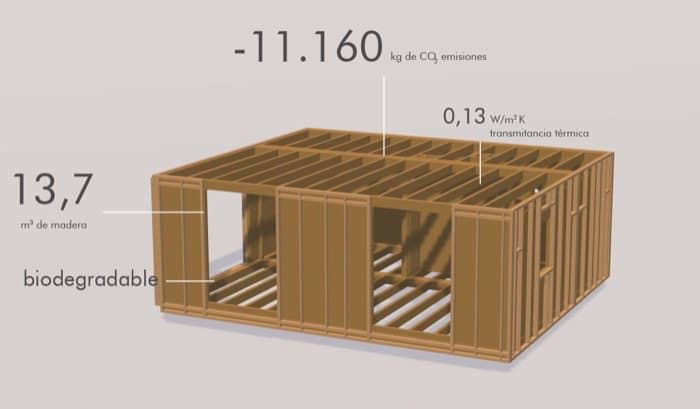 Esta vivienda necesitó tan solo 10 semanas para construirse, su transporte se realizó con dos camiones, y luego ocho personas durante 7 días más para ensamblar y completar en el sitio los acabados de los dos módulos. Según su fabricante, esta casa prefabricada ecológica tiene un consumo en climatización de tan solo 15.05kwh/m2, que supone un ahorro del 90%, si lo comparamos con una construcción convencional, y una huella negativa de CO2 de 56,95kgCO2/m2.