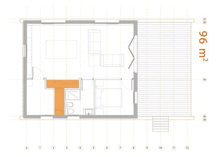 El proyecto está formado por dos módulos prefabricados, además de un gran porche orientado al sur y con vistas a la sierra. El módulo más grande (4.5 x 9 metros) es un espacio diáfano destinado a salón, comedor, y cocina, mientras que el segundo módulo (3 x 9 metros) es el que contiene el cuarto de baño, dormitorio, espacio técnico, y un estudio polivalente. Ambos módulos ocupan una superficie construida de 96m2.