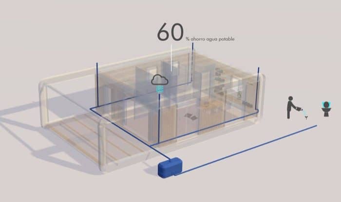 - El agua de lluvia se recoge y almacena para luego ser reutilizada en el inodoro y riego del jardín. También cuenta con filtros para mejorar la calidad del agua potable.