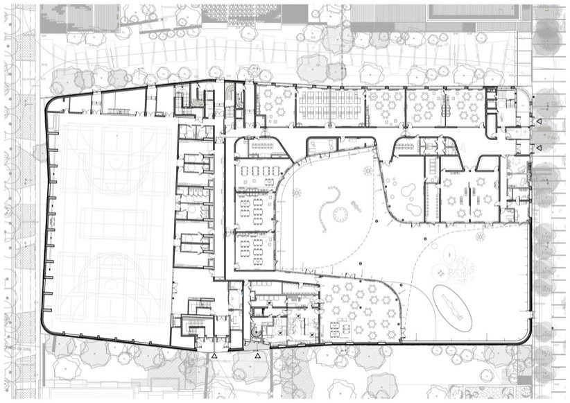 Las clases están dispuestas en varias plantas escalonadas. Las instalaciones deportivas están a disposición de la comunidad de vecinos del distrito. El pabellón tiene una altura libre de 12 metros, y justo encima de él es donde está ubicado el jardín principal del colegio. Esa fachada quebrada tan peculiar se ha formado con grandes bloques prefabricados de hormigón.