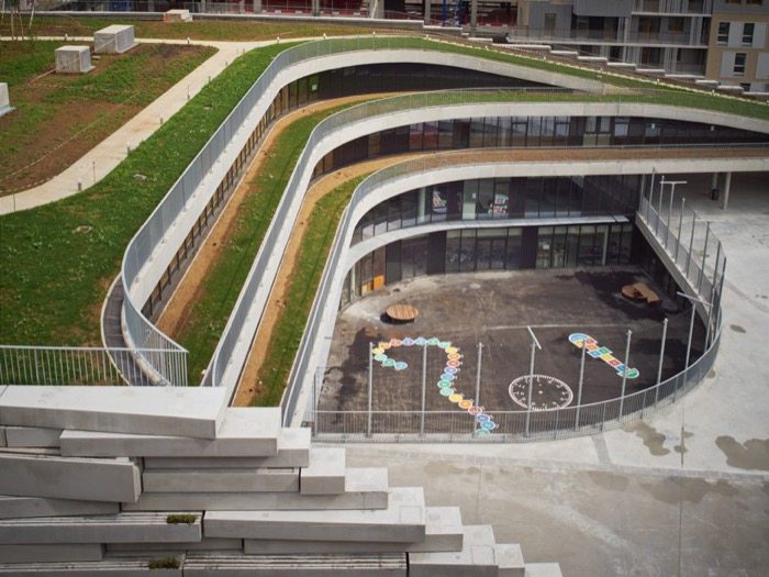 Este extraño proyecto corresponde a una Escuela de Primaria construida en la periferia oeste de París (Francia). No solo introduce vegetación en un entorno urbano, sino que además dispone de una singular fachada que invita a ser el hogar de determinadas especies autóctonas. Es un edificio con azoteas ajardinadas que tiene dos estructuras bien diferenciadas. Por un lado están las 18 aulas de la escuela, y por otro hay un pabellón deportivo.