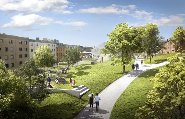 El distrito Södermalm está en una isla de Estocolmo, formando parte del lado sur de la capital sueca. En ella viven casi 100.000 personas, y para un enclave de estas características el estudio de Utopia Arkitekter propuso un conjunto de bloques de pisos (condominios) con azoteas ajardinadas. Dichos jardines sirven de espacio público, funcionando como una continuación del Parque Högalid cercano.