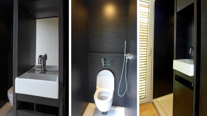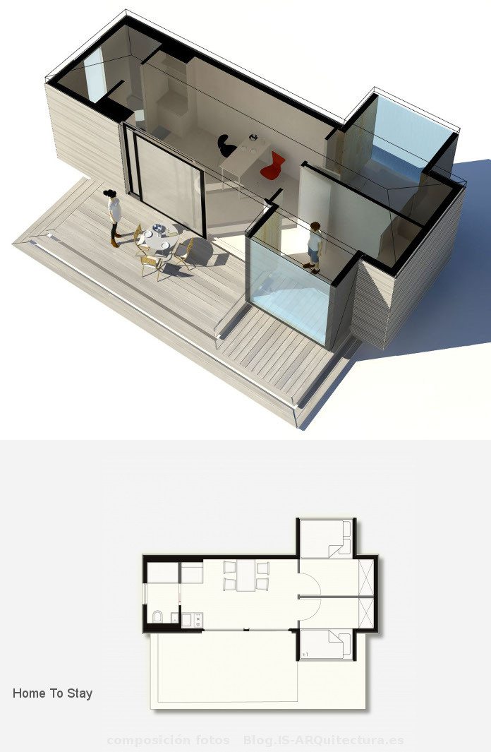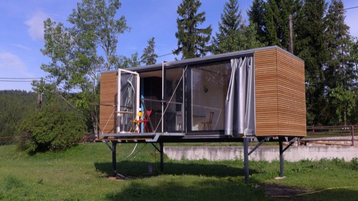 Pero este diseño de casa diminuta sorprende por la disposición de la cama, que está metida en una caja de madera que se desliza hacia fuera, dándole más espacio a la sala. Puede construirse con una caja más grande y poner ahí una cama de matrimonio, e incluso añadirse otro módulo deslizante. Ese es el caso de la segunda versión (Home To Stay), que está pensada para utilizarse como vivienda permanente, pero que en este caso se monta sobre una cimentación de hormigón. También es importante aclarar que el fabricante está dispuesto a adaptar su diseño a otras necesidades.