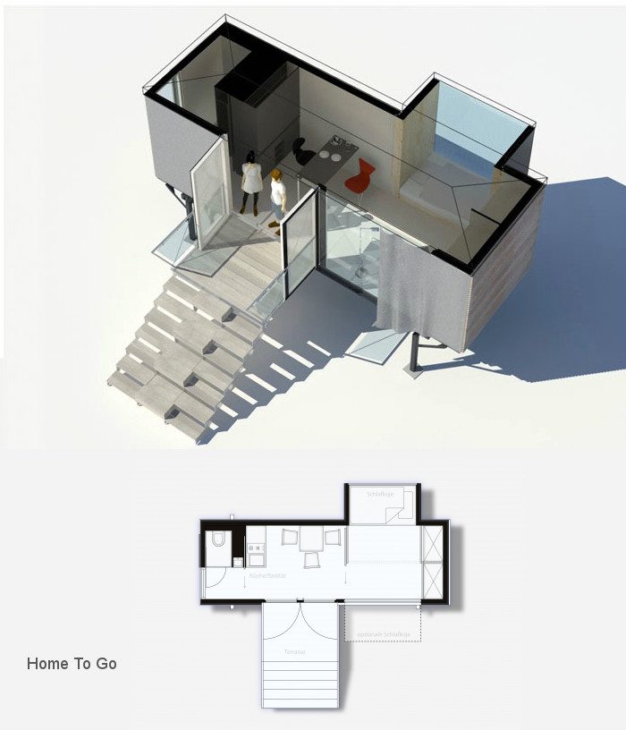 Toda la vivienda se fabrica en taller siguiendo un gran compromiso por la sostenibilidad. Pero también mantiene en mente una alta relación entre calidad y precio, estando disponibles dos modelos, según las intenciones y necesidades del cliente. El que se ve en las fotografías corresponde a la versión más simple (Home To Go). Está montada sobre unas patas metálicas que le permiten estar 1,5 metros por encima de terreno. Cuenta con un espacio que se puede utilizar para dormir, cocinar, estar, y comer. Detrás de la cocina está el cuarto de baño, que tiene una ducha (con inodoro) y un lavabo.