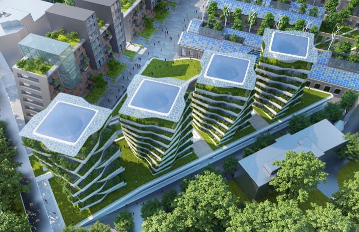 - Un paisaje lleno de árboles. La plantación intensiva de arbolado no solo se ha diseñado por su valor estético, también por los beneficios medioambientales que conlleva. La vegetación está presente en todas las cubiertas y terrazas de los nuevos edificios, también para el cultivo de alimentos y de plantas aromáticas.
