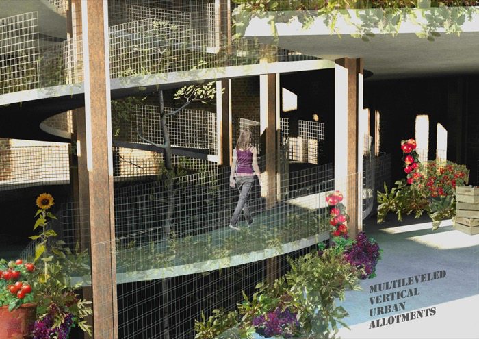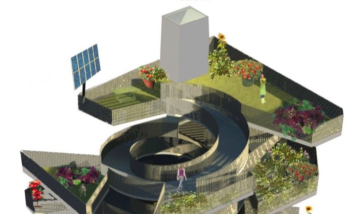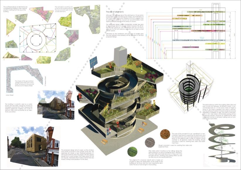 Este proyecto está pensado para darle un uso público a determinados espacios urbanos abandonados. Emplea estructuras verticales, desarrolladas a lo largo de una rampa en espiral que va dejando en su recorrido pequeñas parcelas para el cultivo de hortalizas. Es una solución innovadora para formar instalaciones de huertos urbanos verticales, en múltiples niveles. Surgió como proyecto final de curso de una estudiante universitaria.