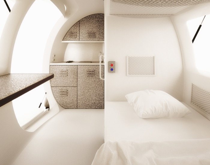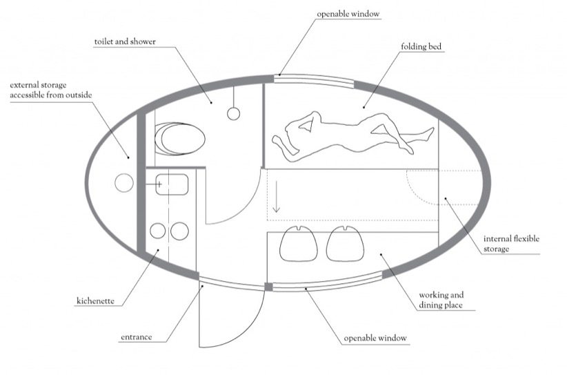 A pesar de su tamaño tan reducido, los creadores aseguran que en esta casa pueden vivir con comodidad dos adultos. No se percibe en las fotos, pero la cama es plegable, hay dos grandes ventanas opuestas que garantizan una buena ventilación cruzada, y un tablero que puede utilizarse como escritorio o como mesa para comer. Y es que Ecocapsule incorpora una pequeña cocina con agua corriente, además de un cuarto de baño con retrete y ducha. Hay también diversos espacios destinados al almacenamiento, repartidos por todo su interior, y otro más en el exterior.