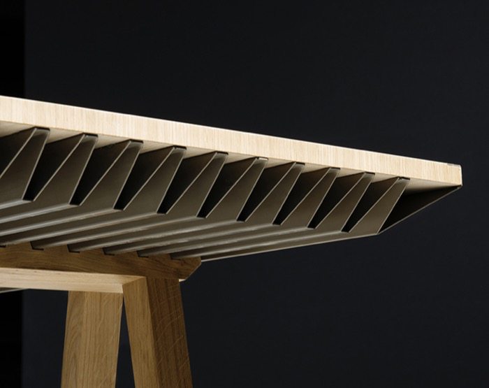 En el caso de Zero Energy, se ha utilizado madera maciza de roble para la parte superior de su tablero (por sus buenas cualidades aislantes). Incluye láminas plegadas de aluminio anodizado en la parte inferior. Cuando la temperatura de la habitación aumenta, el mueble va a absorber el exceso de calor, y lo liberará cuando la temperatura vuelva a descender. El material PCM colocado entre la madera y el aluminio se funde a 22ºC (absorbiendo calor); y se vuelve a solidificar cuando la temperatura se sitúa por debajo de ese valor (liberando calor). El aluminio es un estupendo conductor térmico, y al estar plegado aumenta la superficie, y por tanto el intercambio térmico entre el aire de la habitación y el material de cambio de fase. Los pliegues también proporcionan al tablero una gran rigidez, y permiten que sea bastante grande (apoyado solamente en dos caballetes).